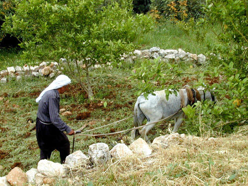用骡子耕地的人