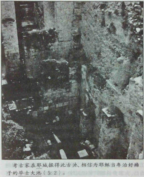 5:2-7 考古学家新近掘出此池,是一个人工造成的蓄水池,长96公尺,池的两端一头阔67公尺,一头阔50公尺,中间隔开为二。池的四边各有一柱,中间隔开的地方也有一柱。池在毕士大区圣安妮堂的地下,与约翰所说的十分符合。由于地势高,水源也许不是山泉,而是雨季的临时水泉,正好是7节的说明。因为不常有泉水来,泉水一冒出,大家争着下去,相信谁最先沾水便得医治(4节)。这瘫子一直没机会。有些译本因见若干早期古卷并无第四节,故也删去。