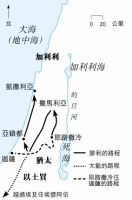 船由米利都航行到哥士、罗底和帕大喇;跟着,保罗和他的同伴上了一艘往腓尼基的货船。他们经过塞浦路斯,在推罗登岸,然后到多利买,最后到达凯撒利亚。保罗在凯撒利亚上岸,由陆路回到耶路撒冷。
