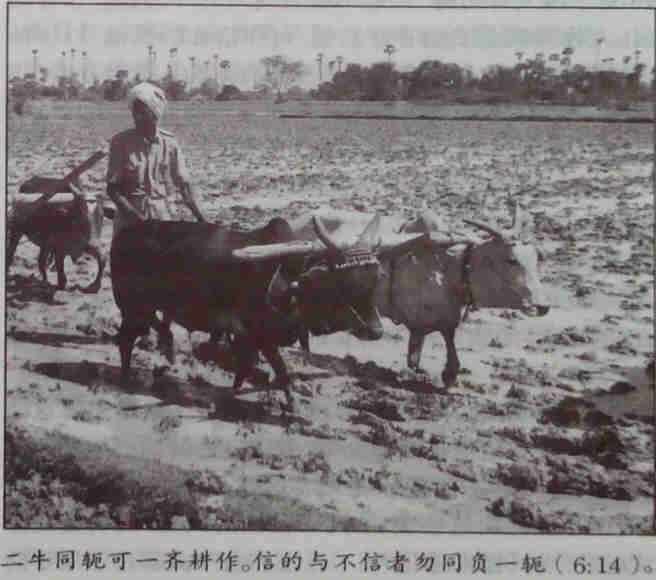 “不可同负一轭”是把旧约“不可并用牛驴耕地”的原则(申22:10),援用到人的生活上,叫信徒不可与不信的人合作;这是不相配的,会破坏信徒生活的圣洁。