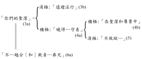 首句原文直译为:“因为这是神的旨意”。“因为”在这里的作用不是指出理由或原因,而是提供解释,就是解释上一节“什么命令”的性质和内容。“旨意”一词的原文34在保罗书信一共出现二十四次(新约六十二次),除了两次指人的意志或意愿(林前七37〔参新译、现中、思高〕,十六12),一次指人的肉体和心意“所喜好的”(弗二3,新译、思高),一次指魔鬼的意思(提后二26,参新译、思高),另一次指主(耶稣)的旨意(弗五17),其余十九次皆指神的旨意。35“神的旨意”一语在原文所用的结构跟保罗常用的两种结构略有分别(见注35),即不是两个名词都有或都没有冠词,而是只有“旨意”无冠词。有些释经者认为,这是由于这里的“旨意”并不是神全部的旨意;36可是,两个名词都有冠词的时候,也不见得所指的就是神全部的旨意(参罗一10;弗六6),因此这解释缺乏说服力。另一些释经者从文法角度提出别的可能性,但他们的解释并不一致。37可能最好的做法,就是接受原文结构确是保罗提及“神的旨意”时较特别的结构,但这结构本身(即是只有第二个名词之前有冠词)在保罗书信中并不是独特的,38因此不必含有特别的意思。本句的真正次序可能是“神的旨意是这样”(即“神的旨意”才是主词〔如在中译本〕,“这”其实是辅词〔或宾词〕),不过原文把“这”字放在动词之先,为要强调上一节“什么命令”的内容就是“这样”。39