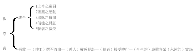 由表可知神所立的救恩,由五方面方能成全;互相连络,方能发生效果。如无耶稣流血,不能成全神的选召;无信徒的见证,圣灵无由感动;听者如不遵行,虽接受无益。再者救恩完全发生于神,然后由神人的合作,乃能使听者得救;既已得救,而后有今生与来生的效果。神人之工,缺一不成;连联之关系密切,少去一份工夫,便不能发生效力。由是凡人欲作救人工夫,当要尽心靠神,如神之全心靠人,方可成事。