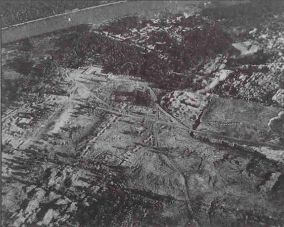 古巴比伦遗址鸟瞰,远处为幼发拉底河(大河)。—《启导本圣经注释》