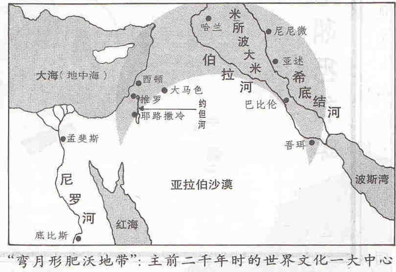 (一)地理环境 旧约环境通常以弯月形肥沃地带(Fertile Crescent)来描述。伊朗与亚美尼亚的高原在东北,小亚细亚与地中海至西奈,埃及在西南。由东边的米所波大米(Mesopotamia)至西部叙利亚及巴勒斯坦,形成一个象新月的地带。