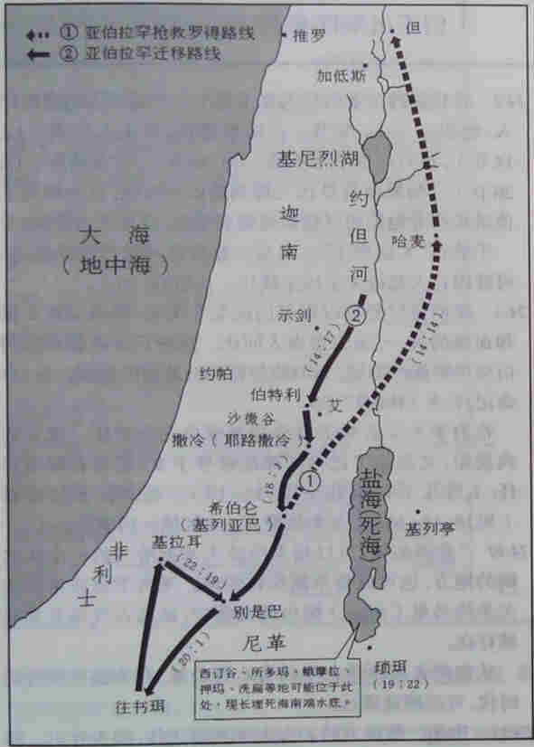 亚伯拉罕在迦南的迁徙:他与侄儿罗得分手后定居希伯仑。听到罗得被掳,率壮丁营救,直追到但,回来在撒冷受到麦基洗德祝福(14:18)。后迁向南地,寄居基拉耳,生子以撒(21:2)。旋移居别是巴(22:19);与妻同葬在希伯仑的麦比拉(23:19;25:9)。
