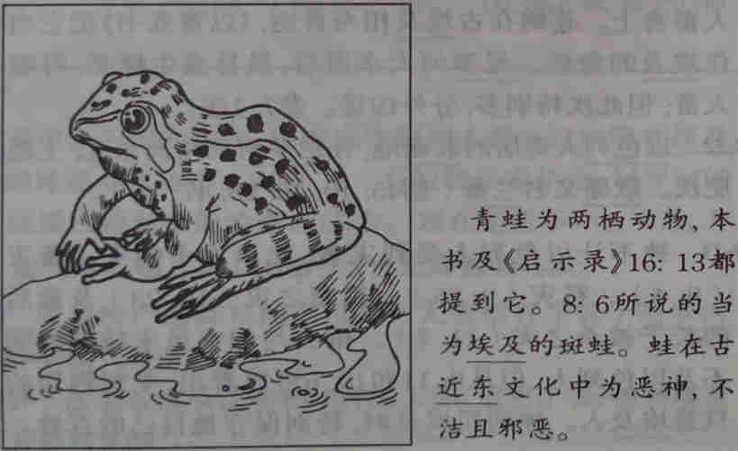 8:1 第二灾为青蛙遍地。古埃及青蛙极普遍,尼罗河水泛滥后尤多。埃及人奉青蛙为神,赐子女神赫克蒂便是蛙的化身。蛙灾并不伤害生命,只造成生活上的不便,连法老的王宫也受到蛙的骚扰。