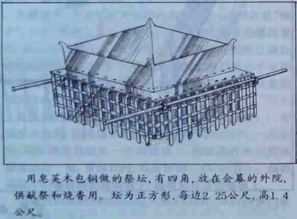 会幕外院长100肘,宽50肘。若以一肘为45公分计算,会幕外院长约45公尺,宽23公尺。圣所和至圣所长30肘,宽10肘,即长14公尺,宽4.5公尺;占外院面积只有十五分之一。