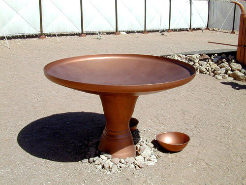 三十17~21 铜洗濯盆 装了水的洗濯盆要安放在幕院里,祭坛和圣幕进口之间。祭司每次进入圣所之前,必须用它来洗手洗脚,作为供圣职的准备。他们藉此在献祭前从手上洗去外界的不洁,并且洁净脚部,免得从街上带来尘土和泥污。这盆子不是特别节日才用得上的器皿,而是每日都要用到的,所以它要等到将祭司分别为圣的就职典礼完成后,才加在圣幕用具总目上。