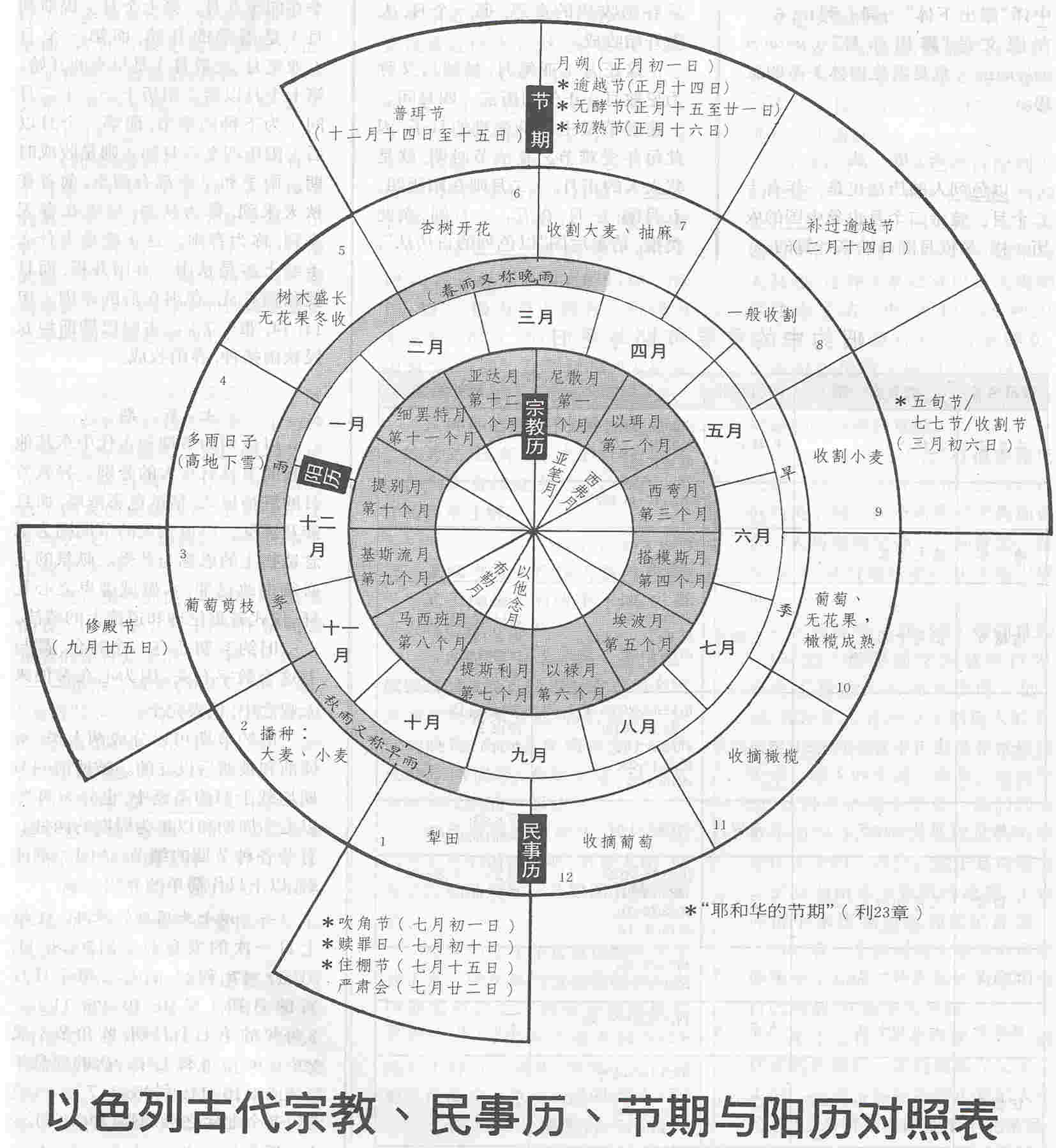 这正月(亚笔月,被掳后又称为尼散月)正值阳历三、四月间。(逾越节是主耶稣受难的日子,因此每年受难节、复活节时期,就是犹太人的正月。)二月则在阳历四、五月间;三月,在五、六月间;余此类推。请参后图“以色列的古历法”。