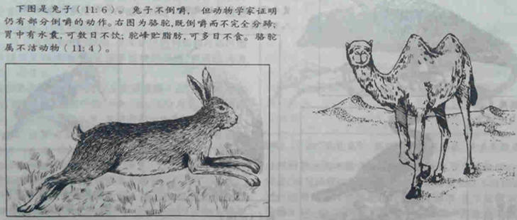 11:6 兔子的胃,不象反刍动物,没有四部分,吃下东西不再反于口中倒嚼再咽入。但它咬嚼食物的嘴部动作类似反刍,故说它为“倒嚼”。兔子不分蹄,属不洁类。