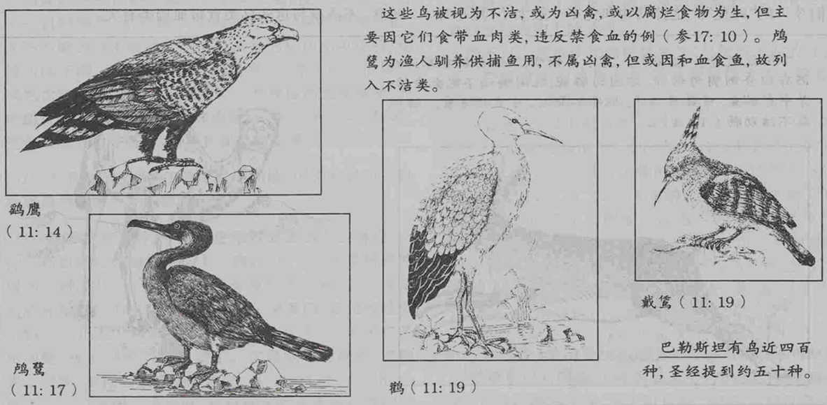 11:13 本节至19节载有一张不洁的鸟类的单子,大多为凶禽或以腐烂食物为生的飞禽。最后列举的蝙蝠(19节),应属哺乳动物。这里所列的若干鸟类,虽经译为中文,但甚难确定其所指,译时恐怕颇多推测。例如16节的“鸵鸟”若译为“枭”或“角枭”应较准确,因鸵鸟不属凶禽。不洁或与这些鸟类食带血肉类有关。