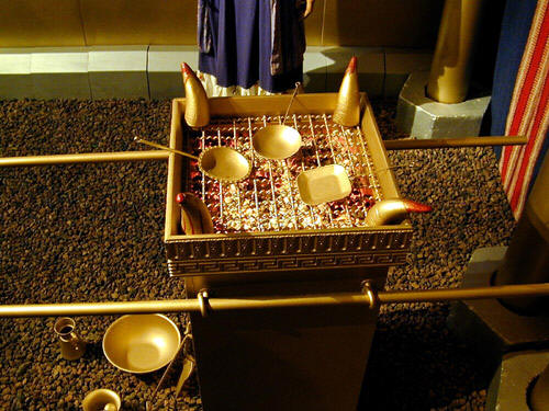 四7 香坛的四角 在坛的四隅上安设犄角,是全古代近东共有的设计。学者的考据显示这些角是神明的标志,然其功用却不明。圣所里面的香坛和外面的祭坛都有角。