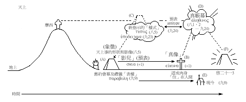 至于垂直线的预表,A是“天上事的形状和影像”(八5),象征摩西在山上所得的指示(C),但却非单纯的象征,因为摩西所见的并非真像本体,C乃是样式( tupo" tupos八5; upupodeigma hupodeigma九23),也是影像( ajntitupo" antitupos)预表D,“天上的本物”,“天堂”(九23、24)的“真帐幕”(八2,九24),而这真帐幕不错已在B“末世显现一次”(九26),藉耶稣“道成了肉身住(原文意思支搭帐幕)在我们中间”(约一14),但天上真帐幕将完全应验在地上,“向那等候祂的人第二次显现”(九28),那时“看哪,神的帐幕在人间,祂要与人同住,他们要作祂的子民,神要亲自与他们同在,作他们的神。”即图中的F。