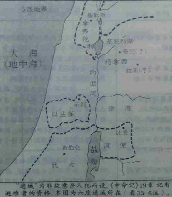 35:6 摩西在利未人的城邑中拣了六座当作逃城(书20:1-9),它们是河东的比悉(属流便支派)、拉末(属迦得支派)、哥兰(属玛拿西半支派)、河西的基低斯(属拿弗他利支派)、示剑(属以法莲支派)、希伯仑(属犹大支派)。《出埃及记》21:13曾提到逃城的设立。