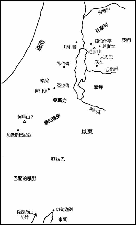 (丙)摩押和以东,二十章十四节至卅六章十三节(约五个月,参见卅三章卅八节和申命记一章三节)。就是在这个区域,发生了第壹部分最后的事件和所有第贰和第乂部分的事件。
