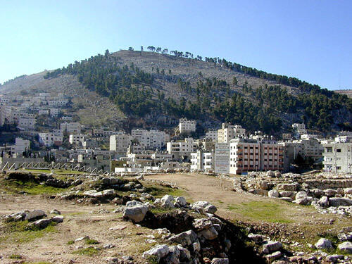 九35~37 山的影子 迦勒和西布勒站在城的东门往东瞭望,在他们正前方的是阿斯卡尔平原(Askar Plain),东南(乌尔梅山〔Mount el-Urmeh〕)、东北(卡比尔山〔Mount el-Kabir〕)都有山岳。日出之时北山的西麓和南山的北麓(两山都有树林)都笼罩在阴影底下。乌尔梅山顶有一个建于这时代的碉堡,可能是亚比米勒的大本营(41节的亚鲁玛)。