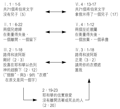 路得记有一个非常对称的结构,从内容去分析,全书可分为七段: