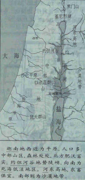 1,以色列人所取得的迦南地,论面积不到我国海南岛或台湾的一半,但山峦起伏,成为统一的大障碍。中央险峻山脉将全国分切为二,东边为陡峭的约旦河谷,西边为沙仑平原,伸展至地中海。以色列人受地理环境影响,至为分散;聚族而居,各自为政。只有在每年全境共庆的三大节期,或重申与耶和华的立约,以及遭逢关乎全民安危的大局时,才有机会走在一起。由于组织松散,时受四邻欺凌。
