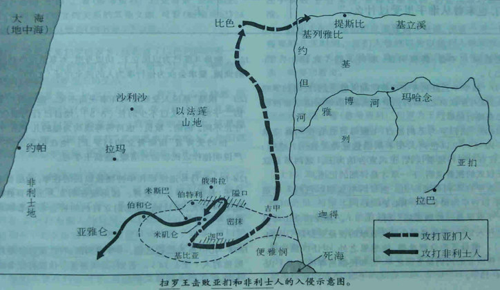 13:5 非利士人在迦巴的前哨受到约拿单的攻袭,又听见扫罗正在吉甲结集兵力,也来到密抹,准备战争。