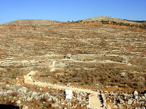 一3 示罗 以利加拿的家乡无论是在便雅悯的拉玛还是以法莲的拉玛琐非,前往示罗都是十五哩的路程。一家大小则要两天才能走完这段路程。示罗的遗址按考证是塞农废墟,大约在伯特利和示剑之间的中点。这个占地七英亩半的遗址位置极具战略性,并且土地肥沃,水源可靠,很方便就能到达贯通以色列心脏地带的南北大道。当地发现的铁器时代一期废墟颇具规模,亦有大火烧毁的痕迹。这时代出土的建筑物有公共的房屋,但没有神殿的痕迹。神殿最有可能的位置,是侵蚀和后来的建筑破坏了的遗址顶部。