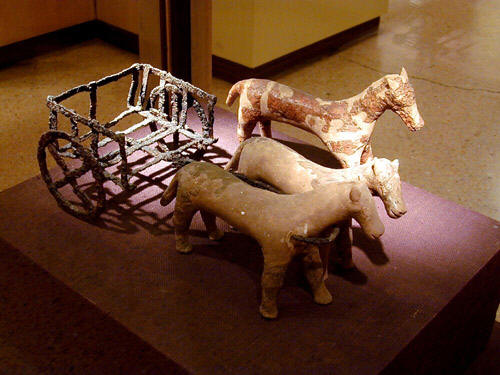八4 战车 叙利亚这时代的战车设计,与主前九世纪亚述浮雕之中描绘的相同。这些战车以双马负轭拖拉,旁边另有一至二只套了挽具的马。载客的小平台安装在后轴之上,车轮木制有辐。乘车者一人负责驾驶,一人则配有弓箭枪矛。二人站于车上,护栏只高及大腿中部。