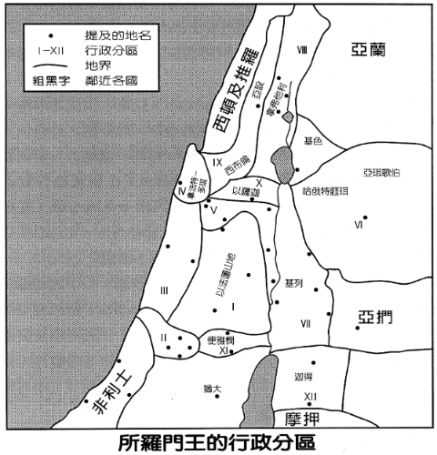 新的分区有助于统一收税及征召劳工。这制度显然是所罗门创始的,并非受到埃及的影响159。所罗门试图尽量保持支派分区(Ⅰ、Ⅱ、Ⅹ、ⅩⅠ),纳入邻近新占领的旧迦南区域(Ⅱ、Ⅳ、Ⅴ),并作适度调整,以便将外族因素纳入王国势力范围之内(Ⅵ、Ⅶ、Ⅸ、ⅩⅡ)。参考对页的地图。这个计划并不是为了剥削每一地区几乎均等的经济潜力而设,也不是故意要削减支派家族的独立性,特别是“约瑟家”。这个新的制度乃由早期的作法发展而成,基本上一直沿用到分裂王国时期结束均未改变。其地理分布大概是顺着中央(Ⅰ-Ⅴ)、约但河外(Ⅵ-Ⅶ)、北部(Ⅷ-Ⅹ)及南部(ⅩⅠ-ⅩⅡ)160。