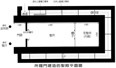 在这整个叙事中,圣殿被称为“殿”(希伯来文为“家”,be^t[, byt[)或一如后来在亚拉得出土的一片瓦片所显示的,被称为“耶和华的殿”(byt(1)yhwh)196。其内部长三十公尺,十公尺宽,十五公尺高,以大肘或王室的肘(约50公分)为准197。门廊入口是开放的,与圣殿的宽窄一样,“伸出”(ro{h]ab[,NIV)殿(he^k[a{l,NIV 作“主厅”)前十肘(RSV 作“十肘深”)。“殿”乃是借用巴比伦字 ekallu,指极大的建筑、宫殿、圣殿,或是其中的一部分,例如一翼(参17节)。