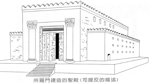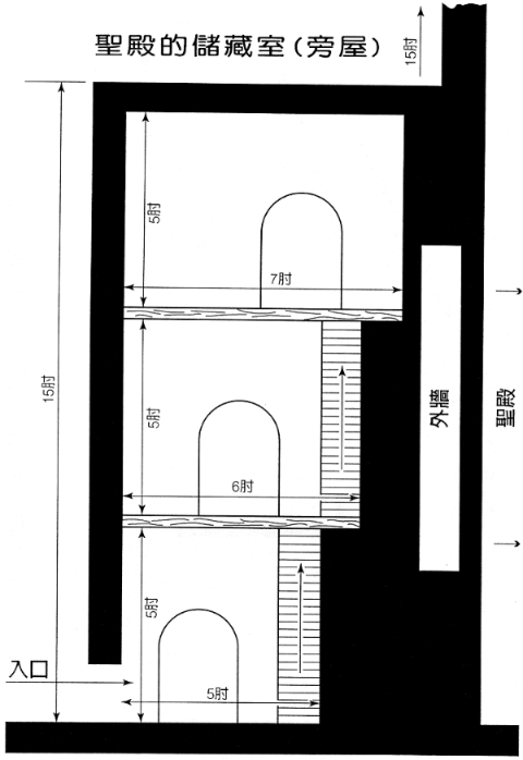 5~6. 旁屋乃是一种建在一个平台之上的“建筑”(NIV),可能是一如扶壁拱架一样的内凹(希伯来文 sela{ ` a^t[ ; 'ribs'“拱肋”;亚喀得文为 s]illu,“拱形物”,因此 NEB 译为“拱廊”)以作为通道之用。这可以解释这些旁屋倚墙而造,拱肋与外墙间的距离如何随着每一层而拓宽。托梁的架或“榫头”(REB;9~10节,mig{ra{`o^t[,“减少”)全都搁在正殿外墙周围,以避免将圣所的墙穿洞(7节)。这个储物区的总面积有三千零六十肘,乃为了库存供物,是圣殿本身内部的敬拜区面积的两倍200。圣殿可能的样式可参考下图201。