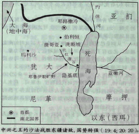 20:16 洗斯坡在隐基底北约10公里,逶迤引入内陆,然后自西边进入提哥亚旷野(在伯利恒南面)。耶鲁以勒在提哥亚的东南。