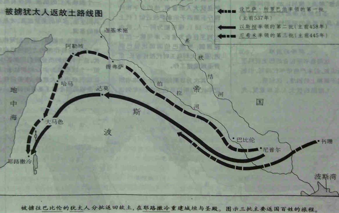 波斯王古列下诏解除迦勒底王朝的禁令,准许犹太人返耶路撒冷(主前538年)。犹大人开始准备,第一批四万余人重返故国,视察圣殿废墟,踊跃输将,齐心建殿,但为当地的撒玛利亚人(他地迁来巴勒斯坦的移民和后代)所阻,到大利乌王时才恢复。圣殿在主前516年完成,举行盛大的逾越节庆典。但以后50年中重建耶路撒冷城垣的工作又受到撒玛利亚人的阻止(拉1-6章)。文士以斯拉获波斯王亚达薛西的支持,率领另一批国人返抵耶路撒冷,依摩西律法重建地方秩序。上一批回国的犹太人已娶异族女子为妻的都须离弃,以保信仰纯正(拉7-10章)。后来亚达薛西王的酒政尼希米,获准返耶城重建城垣。他不顾敌人反对,将城建成,耶城恢复生机(尼1:1-7:72)。尼希米被委派为省长,以斯拉向众宣读律法书,众民欢庆逾越节(尼8:1-10:39),并举行城垣奉献礼(尼11:1-13:3)。尼希米一度回波斯,重返耶城时,发现祭司和百姓中一些违纪和违反律法的事,一一加以整顿(13:4-31)。