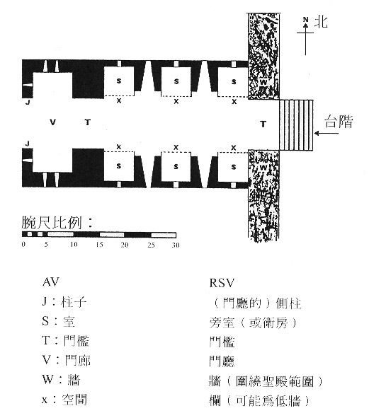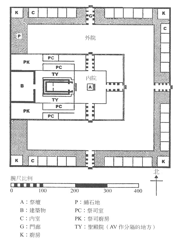 5~16. 外院的东门。以西结的所有量度都是用长腕尺(和合作「肘」),即每尺约为二十又二分之一寸,不是常用的十七又二分之一寸的腕尺。203这样,天使的量度竿大概有十尺三寸长,这是圣殿四周实心墙的可能高度和厚度,有效地从外面俗世的世界中将神圣的分别出来:有趣的是,这里所形容的门廊与所罗门在米吉多的城门很相似,在进口通道的两旁有三个凹处或卫房。204要了解这个而没有图形的帮助是非常困难的,读者最好依照图一继续读下去。以西结被带上前往门槛,或作入口廊子的阶梯,他看见门廊是一条通道,两旁各有三个正方形的内室缩进墙内;尽头是另一个入口廊子,引向一个有多间房子的门口或闸厅(大小有8×20腕尺),该厅再开向圣殿的内院。大部分量度在 RSV 都是可以明白的,但第11节的数位却有混淆。门廊开口的宽度指的是门槛,有六腕尺深(7节),十腕尺宽;十三腕尺的数位是指门廊通道最宽的地方,即两旁房子与房子之间的地方,那里向内缩之窗门的侧柱是在突出的间隔之后一腕尺(12节,RSV),该间隔或称为边房的低间墙。第13节给了我们的全部宽度是二十五腕尺,即1(墙的厚度)+6(边房)+11(走廊减去凹进去的一腕尺之后)+6+1=25。由门到门一语表示,每个边房有一个门引向内院,这个可能性是合理的,因为当节期的时候,这些门可以让守门的利未人站在各人的岗位上,控制那些要涌过门廊的人群。第14节的原文还原无望,RSV的修改最少还有一点道理。雕刻在侧柱上的棕榈树(16节)是一种很普通的装饰,在所罗门的圣殿里也可以找到这种装饰(王上六29~35)。