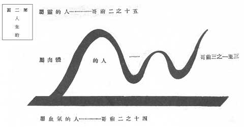 上图在下的黑线便是属血气的人,此等人在座中必有;在上的黄线是属灵的人,即上文所说过与主有叁大关系的;至於中间的黄黑线很像一条蛇,又如波浪的高低极不美观,这是属肉体的人的写真,或者就是你现在生活的情形,是你的肖像,因为神在圣经里曾照了叁等信徒的肖像,你我一看便能自知一己的真面目了。比喻我们与友人同照相,冲晒之後,相貌美好就给值取相,倘若我的面貌本来是丑陋的,你见影片极不像样,以为影时不好,你虽不认这相像你,但这相实在是你的。
