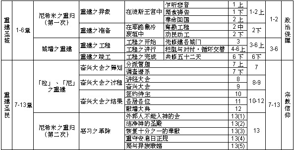 8. 宣读律法书 9. 禁食认罪祷告 10. 签名遵守神之律 11. 归回城邑 12. 献墙大典 13. 革除恶习 |
