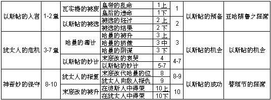 1. 瓦实提被废 2. 以斯帖入宫 3. 哈曼的毒计 4. 末底改的挑战 5. 以斯帖设筵款待哈曼 |