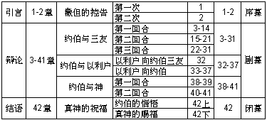 30. 复述现今苦境 31. 坚称守道不偏 32. 以利户:以坦诚陈述己见 *33. 神必救赎悔罪者 34. 神断不至行恶 35. 神使人夜间歌唱 *36. 受苦有益 37. 神不顾念自智人 38. 神:以创造诘约伯 39. 以禽兽之性再诘 40. 责约伯为何显己为义 41. 神万能人难仰比 42. 约伯认罪及结局 |