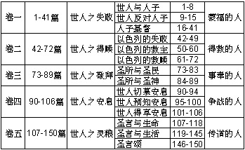 1. 两条道路 *2. 神的受膏者 3. 晨祷 4. 晚祷 5. 晨祷 6. 转泣为安 7. 愿恶断绝 8. 神顾念人 9. 外邦恶人 10. 本国恶人 11. 神察恶人 12. 心口不一 13. 从怨叹到歌唱 14. 无神论诗 15. 属灵人诗 *16. 有主万事足 17. 神的保护 *18. 神的拯救 19. 无言的见证神的见证 20. 出师 21. 班师 *22. 救主 *23. 牧人 *24. 国君 25. 求神训导 26. 求神伸冤 27. 求神拯救 28. 求神听祷 29. 神之威声 30. 谢神医治 31. 求神拯救 32. 悔罪诗 33. 靠神有福 34. 尝试神恩 35. 咒诅诗 36. 善恶之对比 37. 默然倚靠 38. 默然顺服 39. 默然无声 *40. 谢神拯救 *41. 病中吟 42. 渴慕神 43. 求神伸冤 44. 古今 *45. 婚娶诗 46. 神是避难所 47. 大君王 48. 大君王的城 49. 钱财诗 50. 审判的神 |