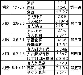 1. 新妇与新郎互相赞「美」 2. 新郎与新妇相会 3. 新妇寻求新郎 4. 新郎称美新妇 |
