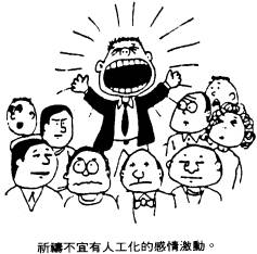过分人工的感情化激动(如:呼天抢地般的喊叫、身体颤动、挥拳踢足等),并不表示就能达到真实的崇拜。激动的情绪在公众崇拜中未必能够引起众人的共呜(或许某些特别情况下有例外),有时还可能会产生令人疑惑或惧怕的心理,如此反而成了崇拜的障碍。即使个人喜以完全释放情感的方式表达,也以不妨碍他人或要求他人随同为原则。