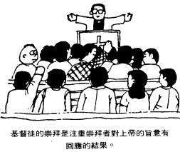 很重要的一点,那就是崇拜中的任何一项节目,皆应达到使参与者有具体回馈行动的目标(包括更新、决志的态度和实际),如此,必能避免落入崇拜的外表和仪式之中。我们不要忘记,崇拜的时间不是一段为了要「打发」光阴的时间,更不是「欺哄」上帝之「我来作礼拜了!」的时间。