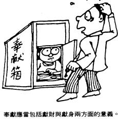 奉献应当包括献财与献身两方面的意义。奉献固然要出自信徒的甘心乐意,然而,奉献也是上帝对信徒的要求(出埃及记二十24;三十四27;利未记十七1-11;十九5;民数记十五1-31;罗马书十二1-2)。