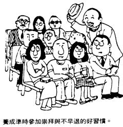 1. 参与服事的人员和会众要建立准时参加崇拜和不早退的习惯和礼貌。