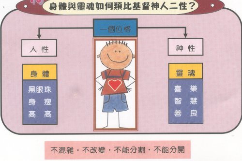 (1) 两性不相混乱(inconfusedly)- 好比心之与物,不能相混,变成一个非心非物的东西。同理,基督耶稣的神性和人性也是不相混乱,变成非人非神的怪物。当我们说基督耶稣是“神人”(God-man 或 theanthropic Person)的时候,指的是他的“位格”,而不是“性质”。